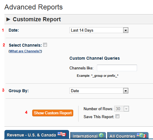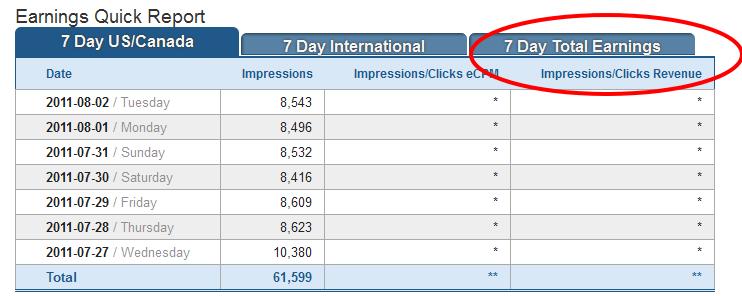 There are a couple of ways in your dashboard to view your revenue. When you sign into your account, you will first see a chart which shows your stats from the past 7 days (remember to click “Total Earnings” so that you can see the US/Canada traffic and International traffic combined):