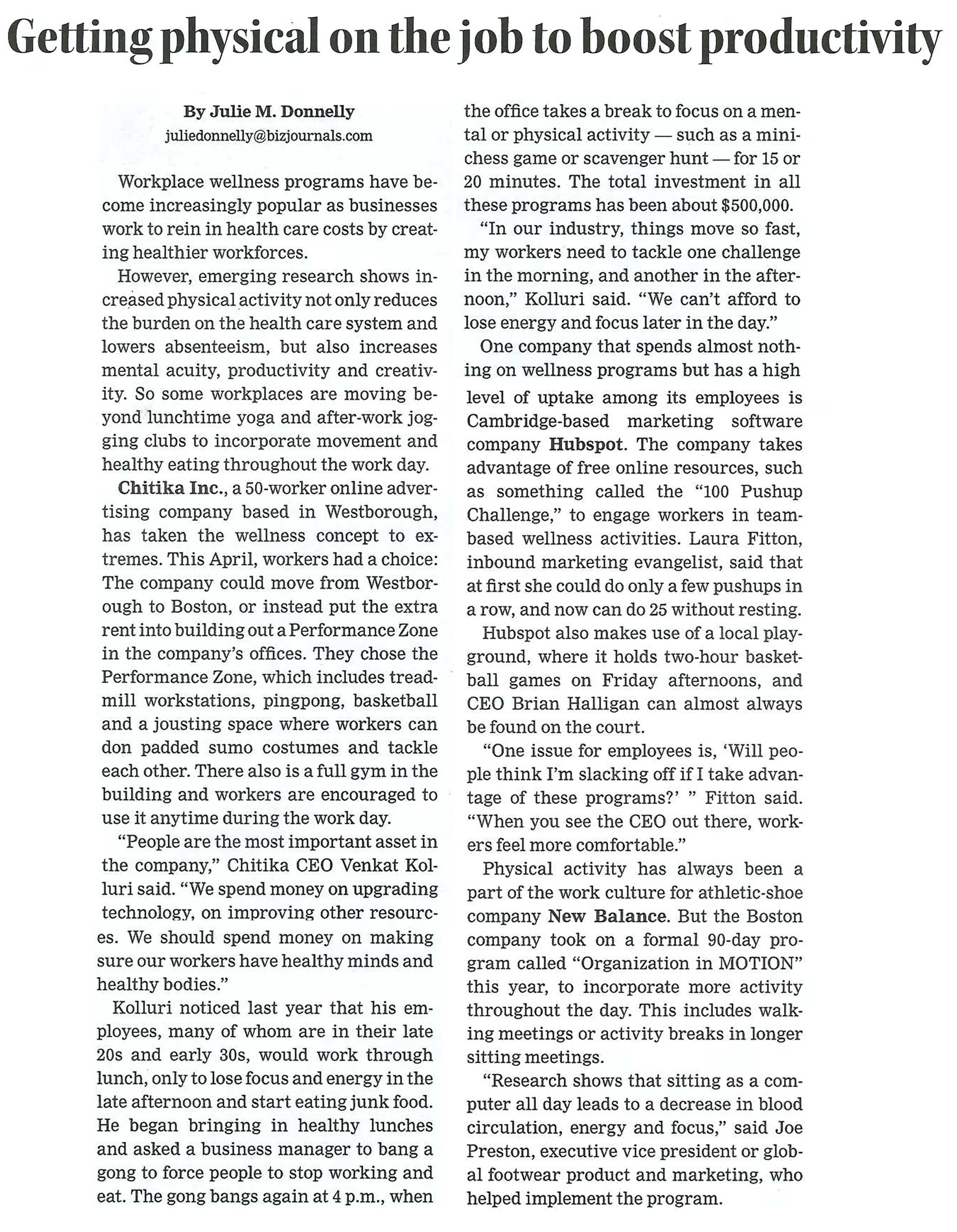 In today's Boston Business Journal, writer Julie Donnelly explores the idea of "Fit for Profit", as managers aren't just promoting wellness to save on employee health costs anymore. They're also finding exercise makes workers more productive, as explained by Chitika CEO Venkat Kolluri.