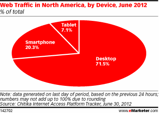 Time is not the only way to measure this shift. A growing portion of internet traffic is coming from smartphones and tablets. Net Marketshare put mobile’s share of global browsing traffic at 10.3% in October 2012. This was the first time mobile had topped 10% of all browsing for the web analytics firm, and its advance might even be greater, as the figure “actually underestimates the total amount of browsing share on mobile devices, since [Net Marketshare’s] sample does not contain data on apps, like maps.”In markets such as the US with high indices of smart device penetration, an even greater portion of internet traffic comes from smartphones and tablets. Online and mobile ad network Chitika estimated mobile’s share of web traffic in North America at 28% as of June 2012.