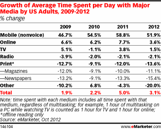 NOV 27, 2012- For years, marketers emphasized a build-for-the-desktop-first approach, with mobile serving as little more than a sideshow. However, rapid advances in smartphone and tablet ownership have changed that equation.Consumers in the US may spend twice as much time today with desktop media as they do with mobile, but time spent with mobile is growing at 14 times the rate of the desktop, suggesting that the two could achieve parity inside a couple of years if both maintain a consistent trajectory.