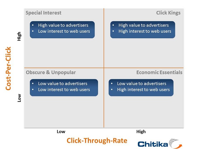 Ads with high CPC but low CTR (Special Interest) are really meant for a narrow audience – meaning, that to maximize their monetization, they should only be shown in cases in which the audiences intent is clear (e.g., showing ads for baseball gear on an sports blog). Alternatively, ads with a higher CTR are generally applicable to a wider audience, and therefore do not require such targeted scenarios to be profitable.
