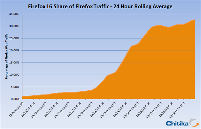 At Chitika Insights, we were interested in seeing what percentage of Firefox users had updated to version 16 before the fix, and how the issue may have affected adoption rates. To quantify this study, we conducted a user agent analysis on millions of mobile ad impressions, from October 9th through October 16th, 2012. Looking solely at impressions coming from Firefox browser versions, we were able to observe the growth in usage of Firefox 16 since its release:
