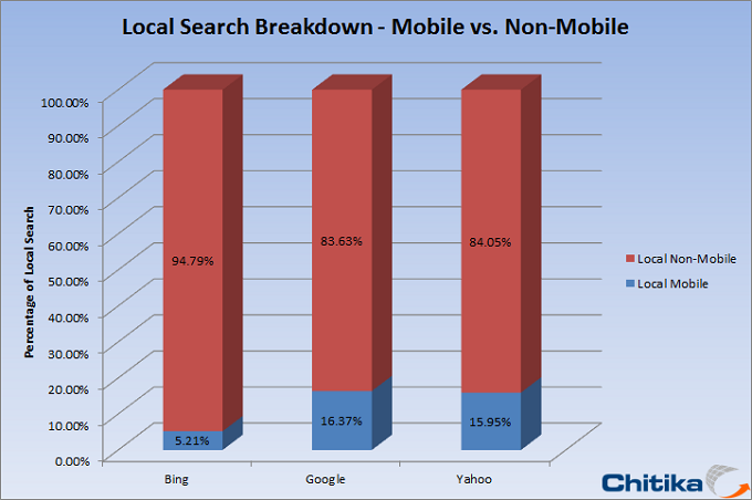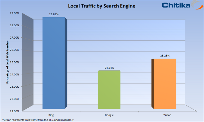 Local businesses have always needed their advertisements to effectively target potential customers in their area. When it comes to advertising on the Web, this task is made more difficult with ads potentially reaching almost anyone in the world. One method for targeting messages to local customers is through a search engine, with the top three being Bing, Google and Yahoo! Each search engine handles a hefty amount of Web traffic, and Chitika Insights looked to quantify how often each platform’s users preform local searches.