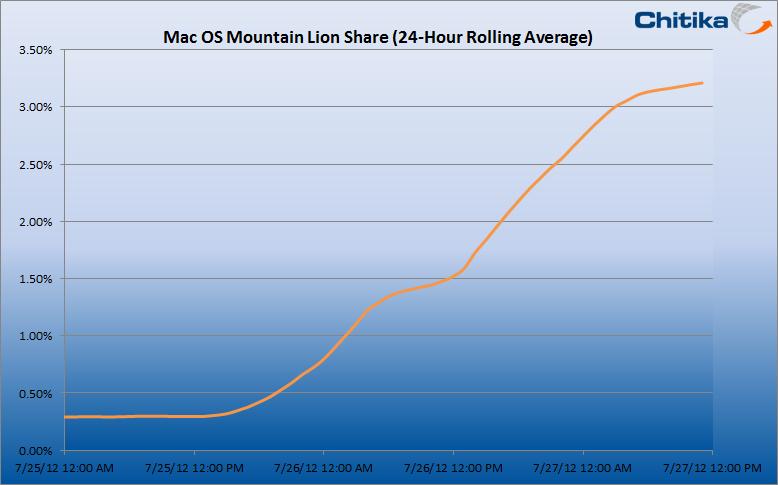 Given the expected demand for the product, and recent statistics showing high adoption rates for updates to iOS, Chitika Insights conducted a study into Mac OS X usage statistics following the release of Mountain Lion. Within the first 48 hours, usage rates for OS X 10.8 were already rivaling those of Mac OS X 10.4 Tiger. While over 45% of users still operate on Mac OS X 10.6 Snow Leopard, anybody using 10.6.6 or higher is eligible for the upgrade to 10.8. Those who skipped the upgrade to Lion, which had mixed reviews, may be more inclined to make the jump to Mountain Lion.
