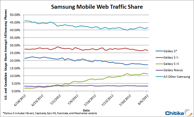 Due to the resounding success of the Galaxy S III in the market so far, Chitika Insights conducted a study to determine how the newest Samsung device was performing relative to its siblings. To quantify our latest study, we conducted a user agent analysis on hundreds of millions of mobile ad impressions, spanning a six week time frame, from June 18 – August 5, 2012. Looking solely at impressions coming from Samsung mobile phones, we were able to observe the growth of Samsung’s Web traffic from the Galaxy S III since its release; depicted in the figure below: