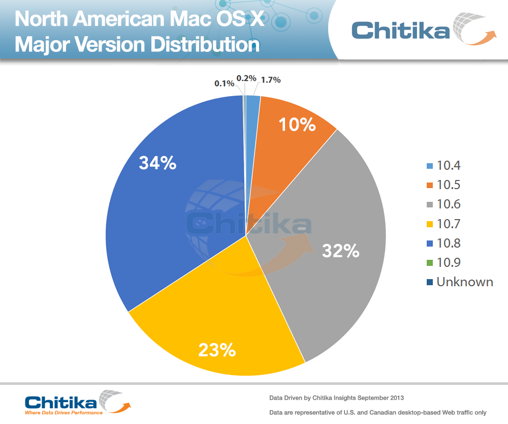 While new Apple desktop and laptops are not expected to be unveiled at the September 10th event, it’s worth noting the differences between the Apple mobile and desktop ecosystems in terms of version distribution. In the case of North America, Mac OS X distribution is much more widely distributed than its mobile counterpart. The data for the graphs below were drawn from a sample of tens of millions of Mac desktop- and laptop-based online ad impressions observed within the Chitika Advertising Network from August 15th through August 28th, 2013.