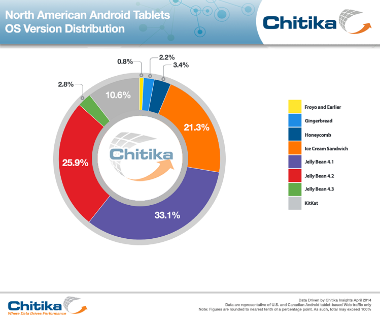 To quantify Android version distribution by device type, Chitika Insights sampled tens of millions of U.S. and Canadian Android-based online ad impressions running through the Chitika Ad Network. The data used within the analysis were drawn from impressions catalogued between March 31 and April 6, 2014.