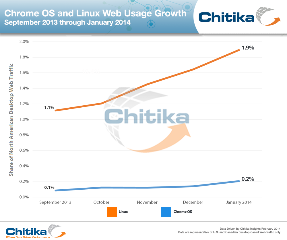 To quantify Chrome OS’ North American usage growth over time, Chitika Insights analyzed billions of U.S. and Canadian desktop-based online ad impressions within the Chitika ad network. The data set analyzed consisted of impressions catalogued from September 1, 2013 to January 31, 2014. For some comparison, continental Web usage shares of both Chrome OS and Linux are graphed over the five-month timespan.