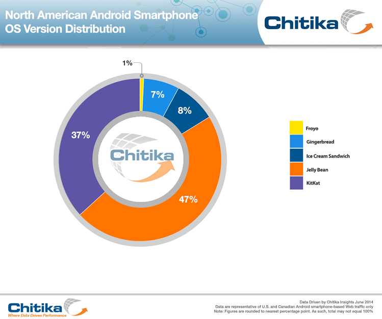 The latest usage data point to KitKat users generating more than one third of all Android smartphone Web traffic within the U.S. and Canada. This is a jump of more than 25 percentage points since our previous study conducted in early April 2014, and makes KitKat the second-most heavily used major Android OS version on North American smartphones next to Jelly Bean.