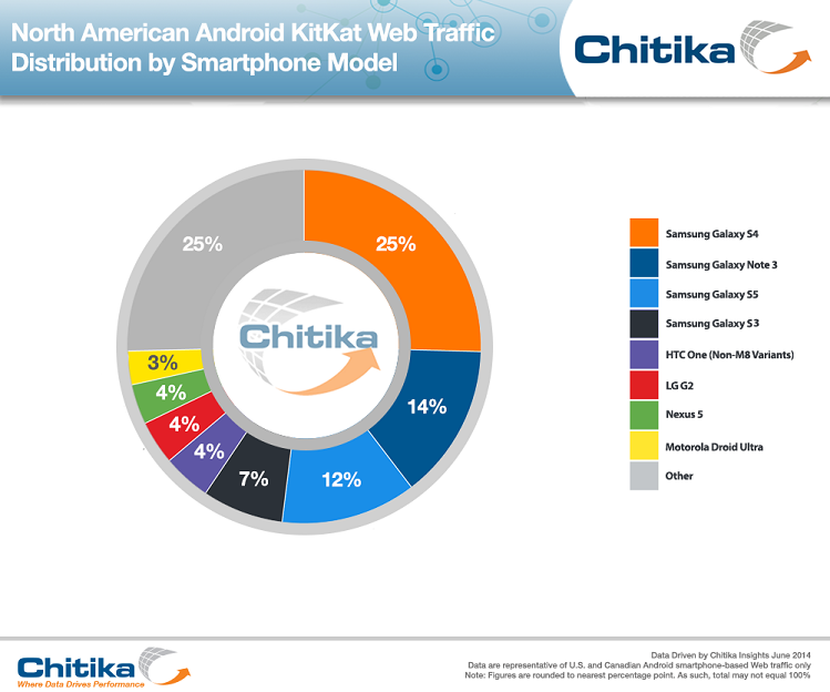 58% of all North American smartphone-based KitKat Web traffic is generated by Samsung users, with 25% coming solely from Galaxy S4 devices. While Samsung itself may be setting the stage to at least partially break away from Android with its own Tizen OS, the present situation presents a lot of value to developers looking to take advantage of the capabilities of Android 4.4 without sacrificing a sizable portion of the potential user base. Based on historical data, this is likely to continue to get better with future Android versions.