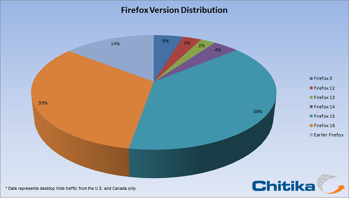 Based on our data, it seems that Mozilla caught the issue before a large portion of their users had updated to the new version, limiting the number of individuals who were operating with security vulnerabilities. Soon after the repair and re-release, adoption rates appeared generally unaffected, with three days of sharp increases in traffic share. Usage continues to increase slowly, and as of October 16th, 2012, Firefox 16 makes up nearly one-third of all Firefox traffic: