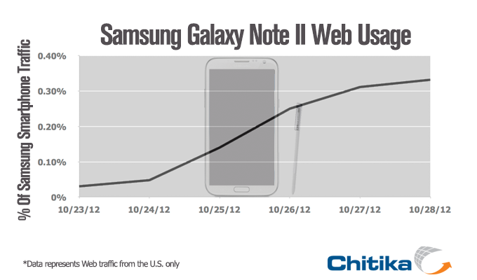 48 hours after the U.S. Cellular launch and 4 days after T-Mobile, the Samsung Galaxy Note II made up 0.33% of all Samsung’s smartphone Web traffic. This is a strong start for the new smartphone as two major carriers are still waiting to release the device. Additionally, as we’ve seen previously, the larger screen size could increase the Web browsing habits of Galaxy Note users.