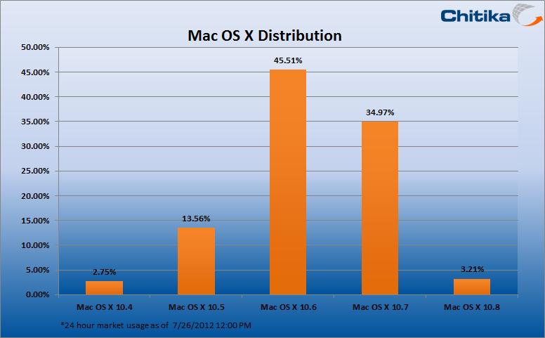 Given the expected demand for the product, and recent statistics showing high adoption rates for updates to iOS, Chitika Insights conducted a study into Mac OS X usage statistics following the release of Mountain Lion. Within the first 48 hours, usage rates for OS X 10.8 were already rivaling those of Mac OS X 10.4 Tiger. While over 45% of users still operate on Mac OS X 10.6 Snow Leopard, anybody using 10.6.6 or higher is eligible for the upgrade to 10.8. Those who skipped the upgrade to Lion, which had mixed reviews, may be more inclined to make the jump to Mountain Lion.