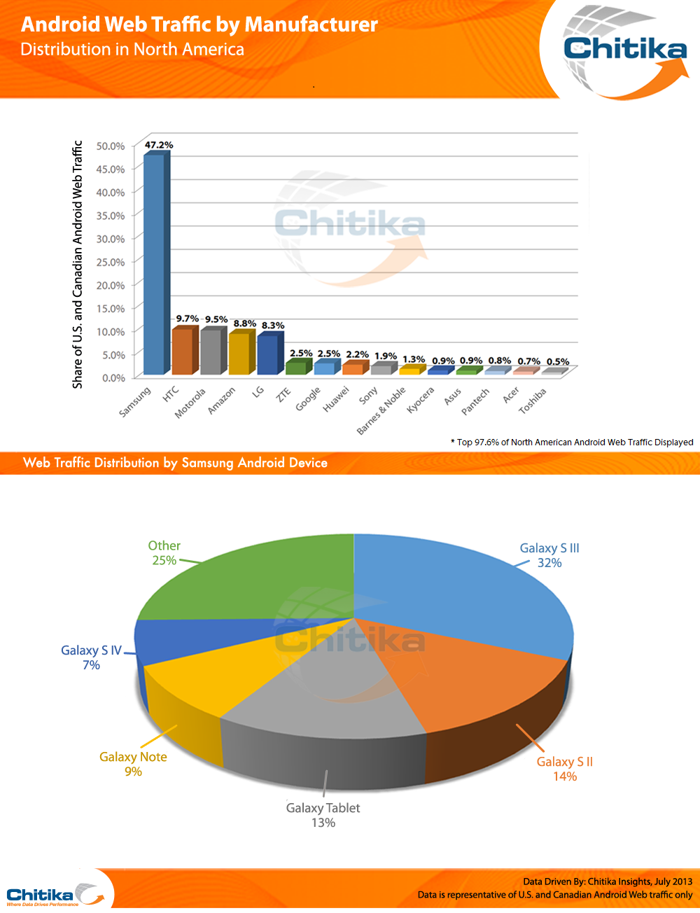 In order to quantify this study, Chitika Insights examined millions of North American Android smartphone- and tablet-based online ad impressions seen within the Chitika network from June 17 to 23, 2013. The data was then segmented by device manufacturer.
