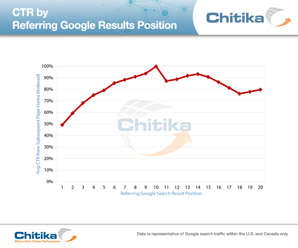 In June 2013, Chitika Insights published a study examining the value of each Google result position. Analysis of the study data revealed that the first position on an average Google search engine result page (SERP) garnered about 33% of Google search traffic. However, as part of Chitika Insights’ latest study examining the advertising implications of the earlier data set, it was found that visitors who got to a site via clicking on the first position in a Google SERP exhibit dramatically low ad click-through-rates (CTR) on the subsequent website.