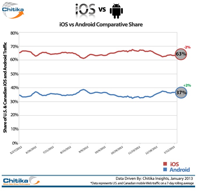 While mobile Web browsing devices have firmly cemented their place in our daily lives, the battle between Android and iOS is as hot as ever. Between the smartphones and tablets running their respective operating systems, Apple and Google lay claim to the vast majority of mobile users worldwide. At the end of November 2012, Chitika Insights took a six-month look back at how Web usage shares compared between the two systems. With only a 2% share change, the data showcased how not much had changed during that period of time. Now that holiday sales and gift-giving are behind us, we extended the study through early January.