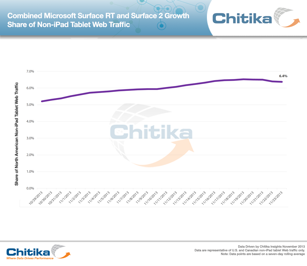 To quantify the usage share of Microsoft Surface RT and Surface 2, Chitika Insights sampled tens of millions of U.S. and Canadian non-iPad tablet online ad impressions running through the Chitika Ad Network. The data used within the most recent analysis were drawn from impressions catalogued across the time frame of October 23 through November 23, 2013. Data points are plotted on the basis of a seven day rolling average. Each point represents the average usage share over the previous seven day time period.