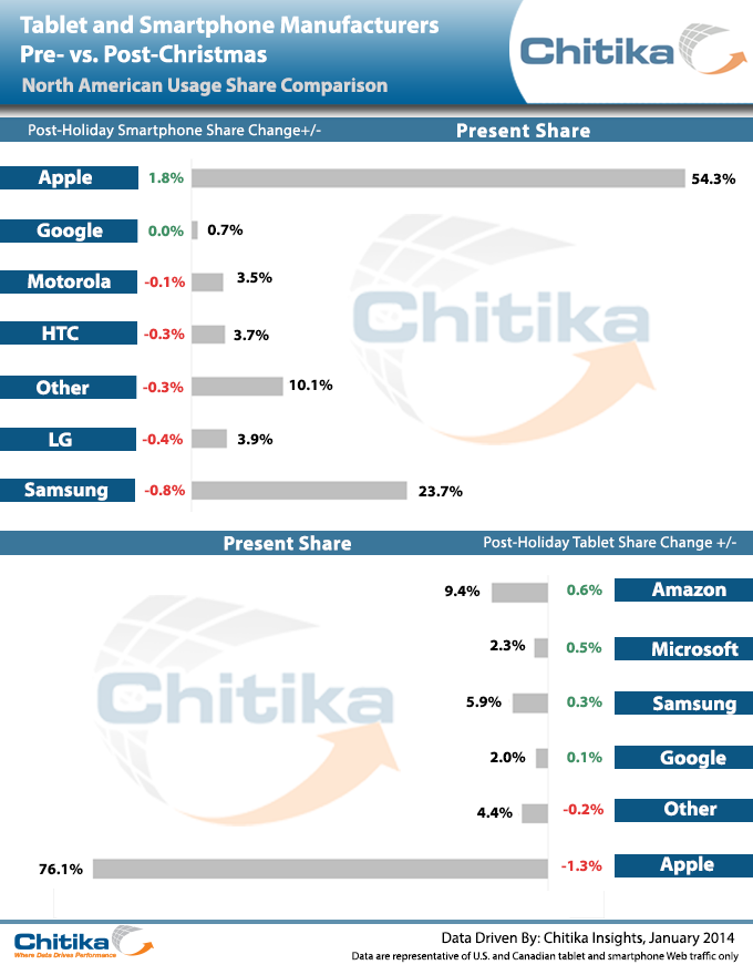 To quantify this latest report, Chitika Insights surveyed a sample of tens of millions of smartphone and tablet online ad impressions from the Chitika network. This study was drawn from a date range of December 20 to December 29, 2013, and only includes Web traffic generated within the U.S. and Canada.